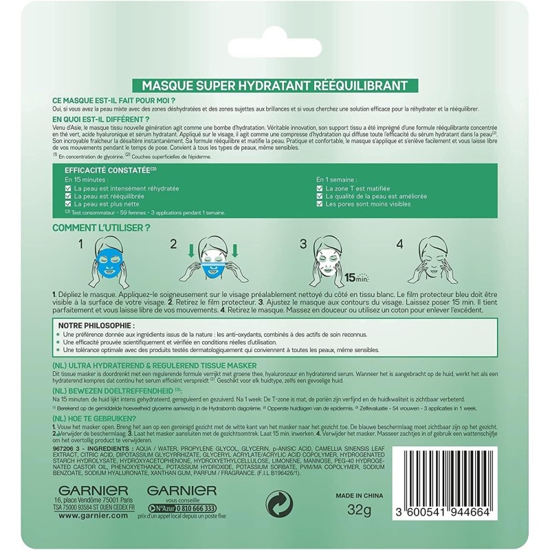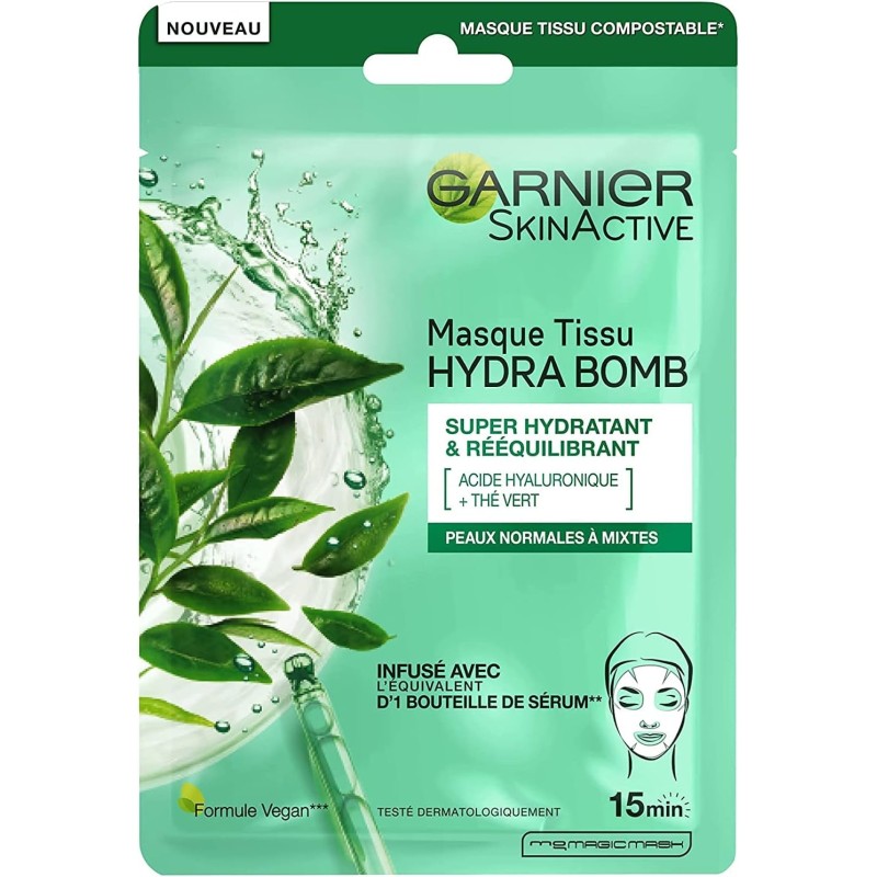 Contenu : 1x Masque tissu Hydra Bomb hydratant et rééquilibrant au thé vert de Garnier SkinActive